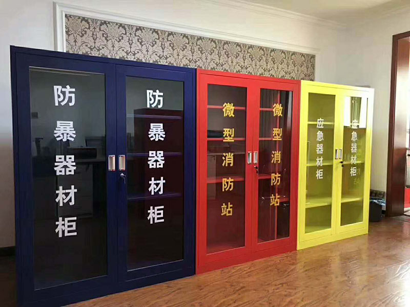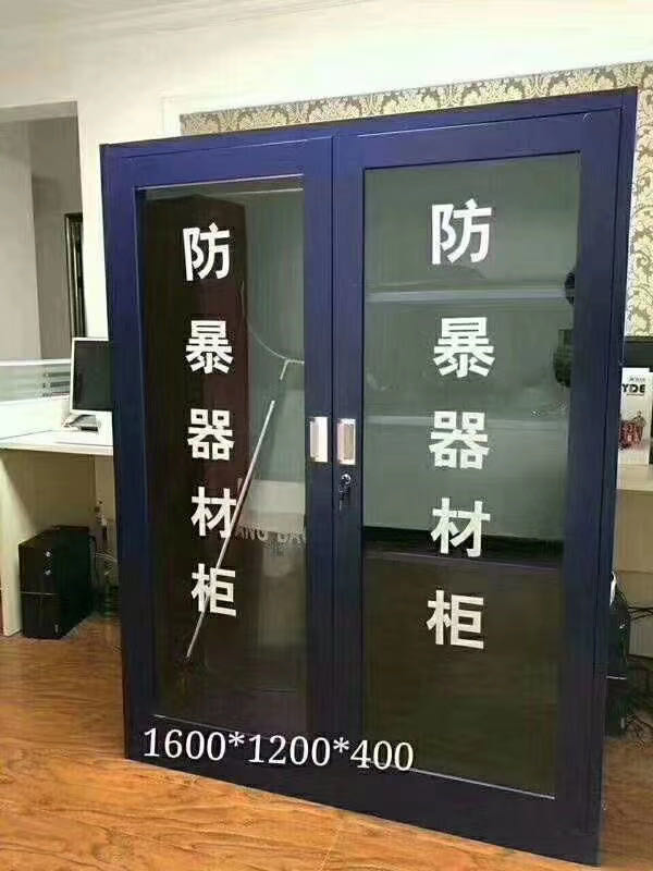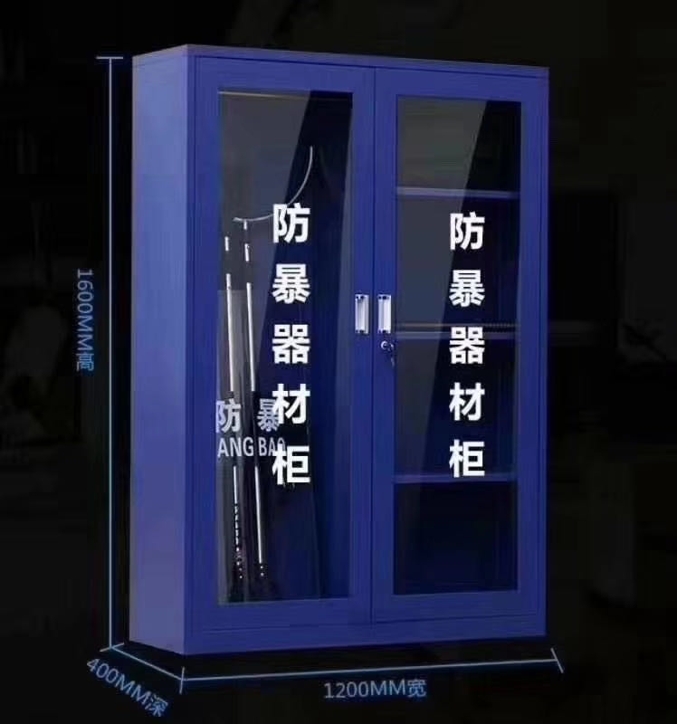 柜子左侧可以放置、盾牌、防刺服、头盔、手电、防割手套等,柜子右侧可放置钢叉、脚叉、橡胶棍等防暴器材;