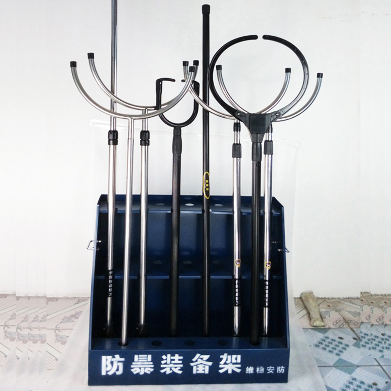 防暴器材装备支架主要用于防暴棍、警棍、警刺、制暴钢叉的收纳,每排有五个收纳孔位,两侧有搬运手孔。