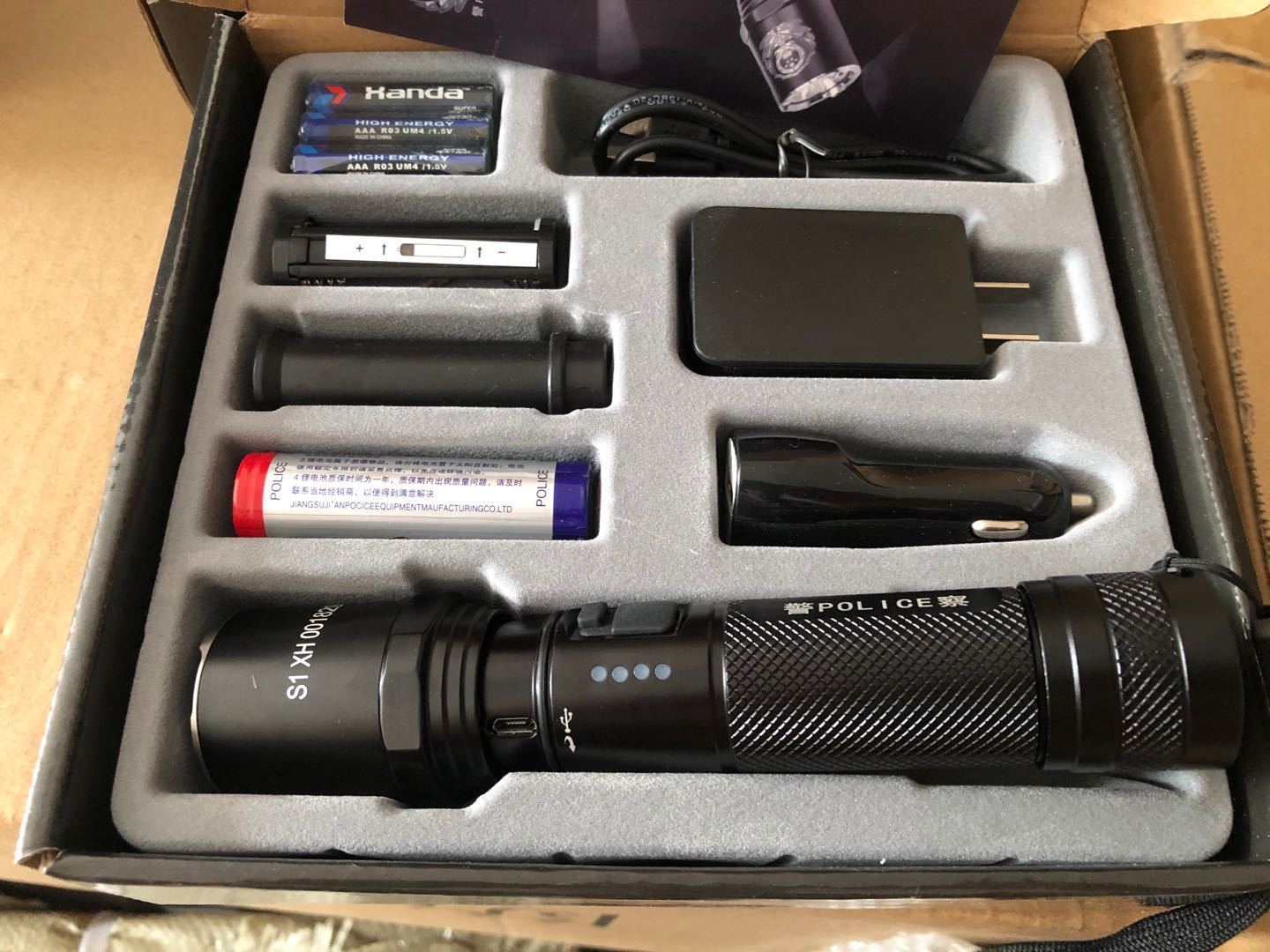 手电筒1只、充电器2个、数据线1根、可充电锂电池1节、AAA电池3节、AA电池1节、AAA电池架1个、AA电池架1个、说明书1份、合格证1份、高档礼盒1个