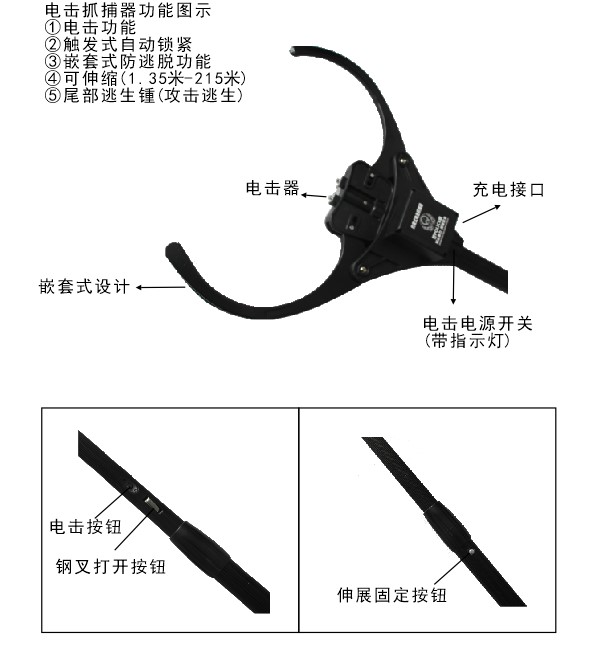 4、叉头前端具有抓捕防脱机构,叉向对向内延扣防脱逃,稳定可靠;有锁口装置,防拉伸,防退缩。