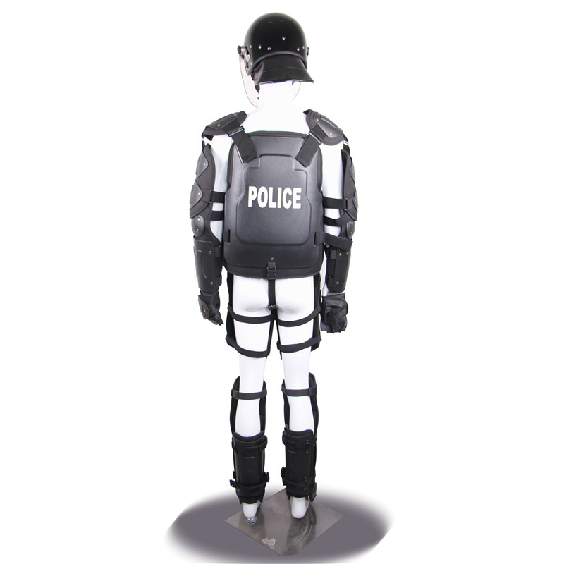 品名:防暴盔甲服 型号:FBF-H-HW01型 材质:前胸/后背--进口ABS 其他部位--PP 内胆--吸能层 内胆面料--涤纶+网眼布(贴身) 重量:单套重量7.6kg 防护面积:前胸及裆部≥0.10㎡ 后背≥0.10㎡ 上肢≥0.18㎡(双肢) 下肢≥0.30㎡(双肢含脚背) 执行标准:《GA420-2008警用防暴服》 防暴盔甲服是由护前胸、护后背、护肩、护上臂、护小臂(肘)、护大 腿、护小腿 (膝盖、脚背)等部件组成。各个相关部件通过尼龙搭扣进行 连接,适应不同身高者穿着。 防暴盔甲服各防护层部件耐高低温性能(+55℃/-20℃,4h)、抗冲击性(120焦耳)、击打能量吸收性能(100焦耳)、阻燃性能、抗穿刺性能等方面均达到公共安全行业GA420-2008标准。